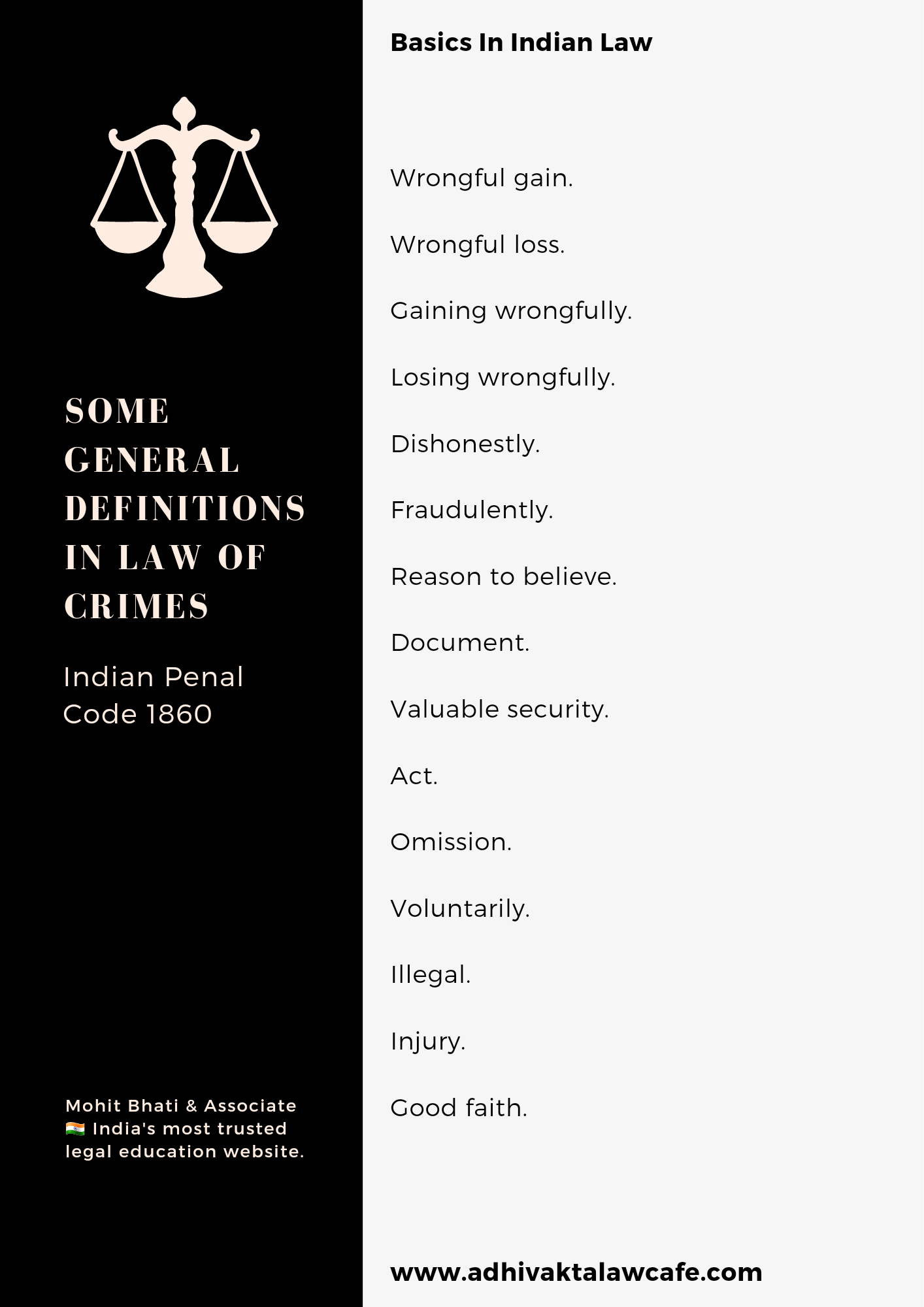 Law provides for definitions of certain words that are used repeatedly in the Penal Code. The purpose is to give them a definite meaning and avoid repetition. We shall have a look at some of the most important terms of the Indian Penal Code.